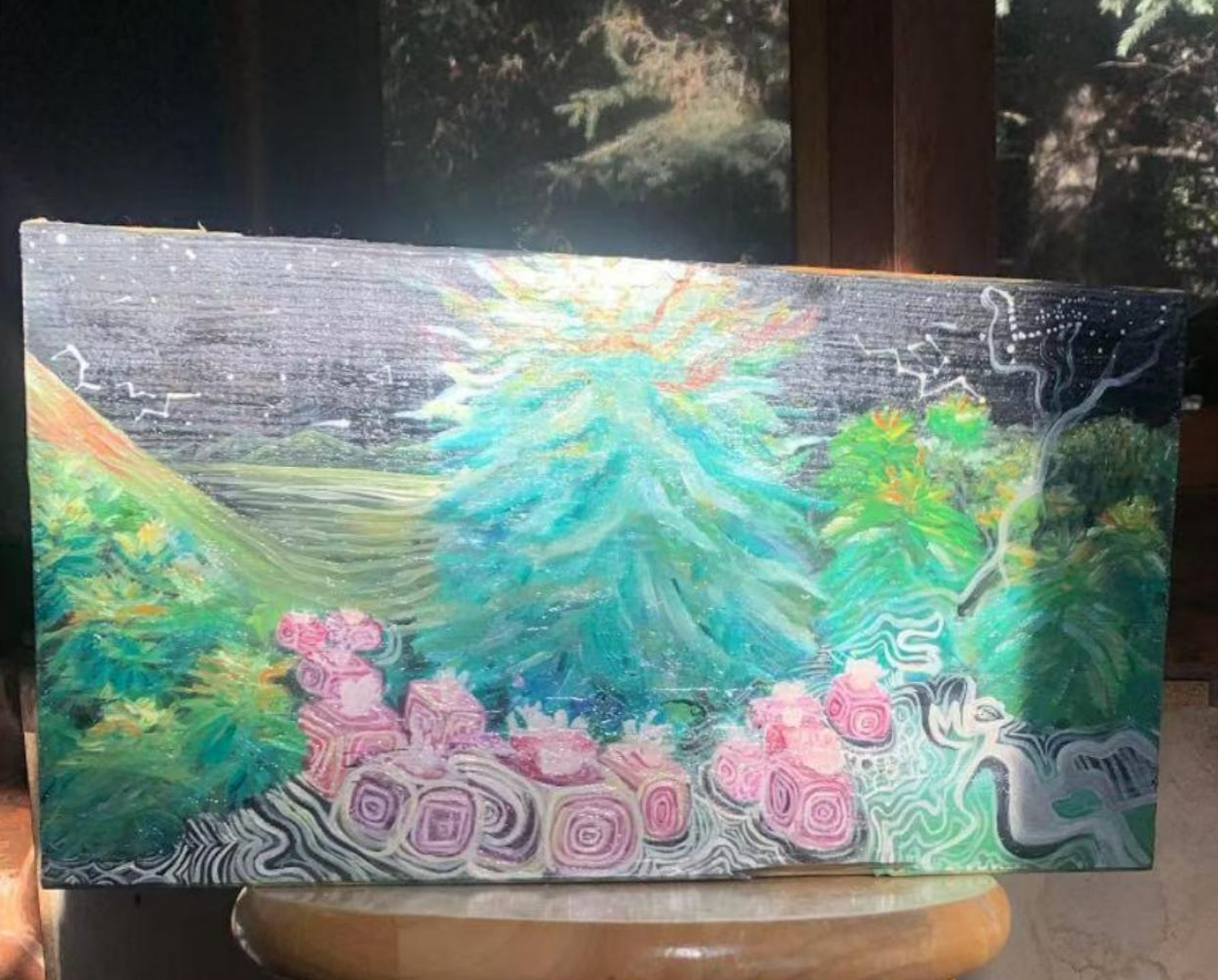 “Cannaklaus Christmas” is a vibrant acrylic painting on wood created in 2023, featuring a whimsical Christmas tree set in a lush cannabis forest. Surrounded by colorful presents, this artwork blends the joyful essence of the holiday season with the playful spirit of cannabis culture. The painting invites viewers to celebrate Christmas in a unique, enchanting way, capturing the magic of the season amid a vibrant, green landscape.