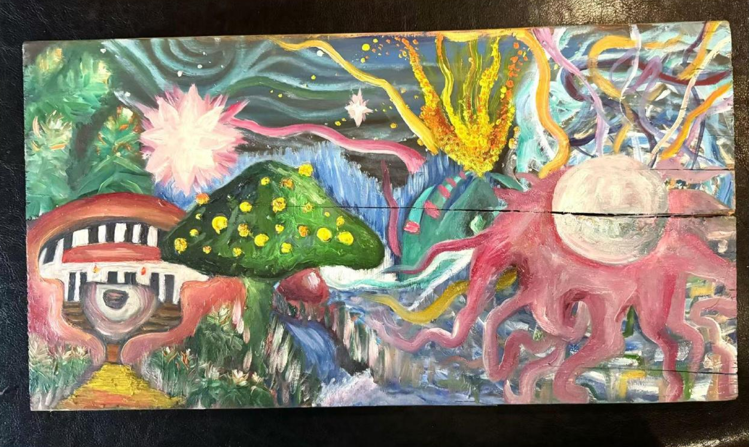 “Mystical Dome Adventures” is an oil painting I created in 2022, painted on wood, that delves into the enchanting journey of growth and transformation. This artwork symbolizes the protective nature of home represented by the dome, while the mystical elements invite viewers to explore the limitless possibilities that lie beyond familiar boundaries. The vibrant colors and textures evoke a sense of wonder and adventure, capturing the essence of embracing change while remaining grounded in one’s roots. This piece embodies my artistic exploration and the magical journey of self-discovery.